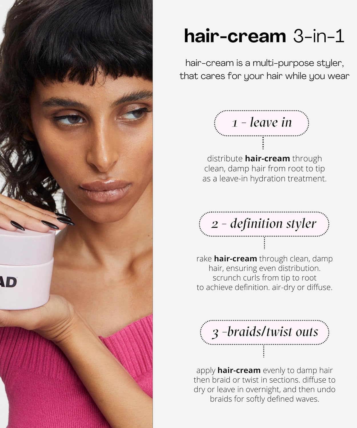 LEAVE-IN: meet the do-all cream. Hair-cream is a 3-in-1 leave-in and styler, that delivers hydrated, buttery soft defined coils, curls and waves