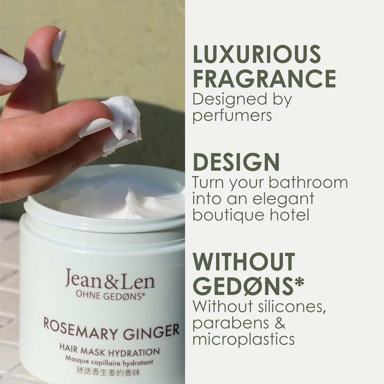 Jean&Len – Hair Mask Rosemary & Ginger Our Hair Mask for dry, brittle and dull hair ensures healthy-looking hair. Thanks to the care formulation with a deeply effective complex of rice protein, vegetable glycerine and black oats, the care complex also restores your hair’s lost strength and suppleness. Look forward to healthy-looking, radiant and manageable hair and let yourself be enchanted by the fresh, spicy scent of rosemary and ginger. Product details: The formulation with a care complex of rice protein, vegetable glycerine and black oats: nourishes deeply and restores the hair’s lost strength and supplenessSpicy-fresh scent of rosemary and gingerWithout parabens, silicones and Microplastics. Application: For deep treatment, apply a small amount evenly to damp hair after shampooing. Leave on for 10 minutes. Then rinse out. Jean&Len Jean&Len was founded in 2013 by Leonard Diepenbrock. The idea: fantastically fragrant skincare that looks cool and doesn’t gather dust in the eco corner. Inspired by the motto “What touches you, becomes a part of you”, the without Gedons* range is constantly expanding and now also includes stylish home & lifestyle products. *GEDONS = ingredients that Len personally likes to do without.