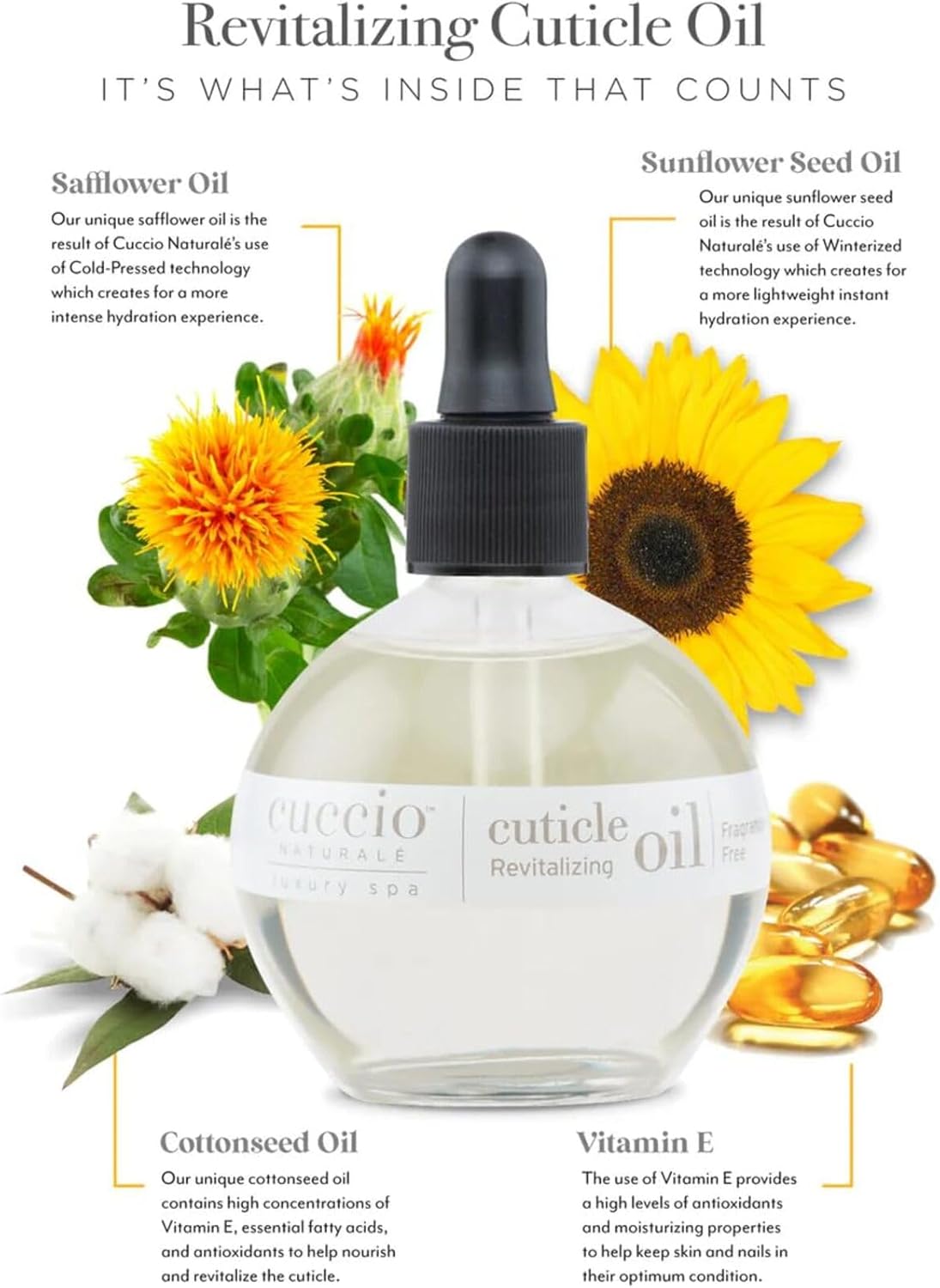 Fragrance Free Cuticle Conditioning Oil Conditions and helps nourish the cuticles. Naturally soothes and moisturizes Contains Safflower Oil, Sunflower Seed Oil, and Cotton Seed Oil Fragrance free, so can be used with any other fragranced products during manicure/pedicure service Apply one drop of Cuticle Revitaliser to each cuticle Massage gently Can be used daily