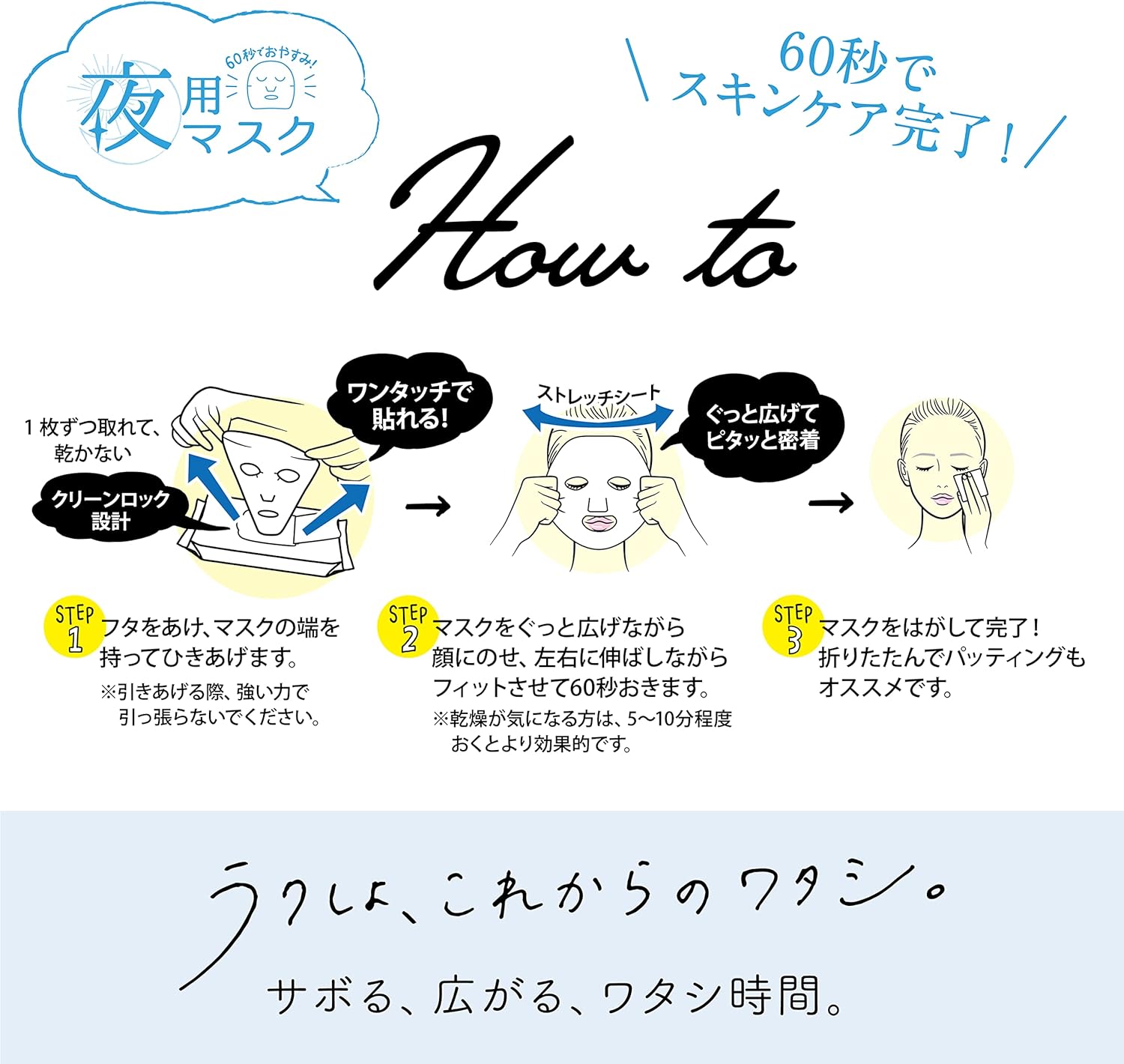 This 5-in-1 special night care mask meets all your skin care needs (toner, lotion, essence, cream and mask) in just one step! How to use: remove 1 sheet of mask and align the mask with the face. Hold the mask on the sides and stretch it gently for your face. Remove the mask after 60 seconds. Dab lightly with the folded mask and you are ready for the bed!