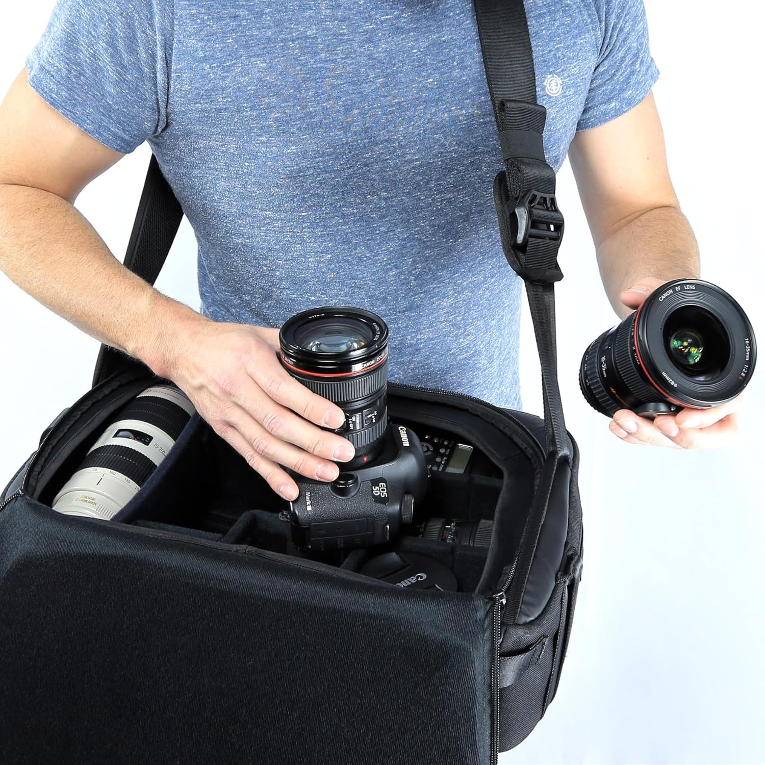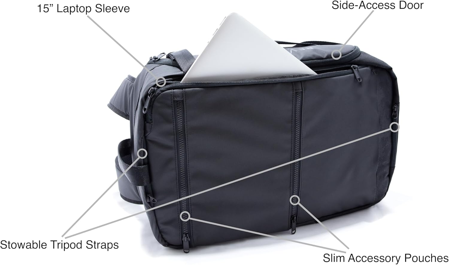 BEVISGEAR’s Top Shelf Camera Bag is the best camera storage solution available for photographers looking to maximize time, space, weight, fit and comfort while being able to have extreme versatility and usability in the field. The Top Shelf has a secure quick release push button that was designed for race car hoods. No more digging for buried and hidden gear. The Top Shelf offers a complete full access layout to all of your gear in 1.1 seconds. It includes the perfect amount of storage. (22L total volume), and is made of weather resistant material. The Top Shelf Camera Bag also comes with a protective rain cover to keep all of your gear safe. The intuitive platform system allows you to use the main compartment as either a laptop stand or lens changing system. Let the Top Shelf hold your camera while you change your lens and reduce the chances of dropping your gear. Easy to customize to and fit all your photography and videography gear with customizable inserts. Exterior dimensions: 19 x 12 x 7 inches. Interior dimensions: 18 x 11 x 5 inches. *Note, The Top Shelf does not accommodate cameras with battery grips attached, unless laid flat without the lens attached.