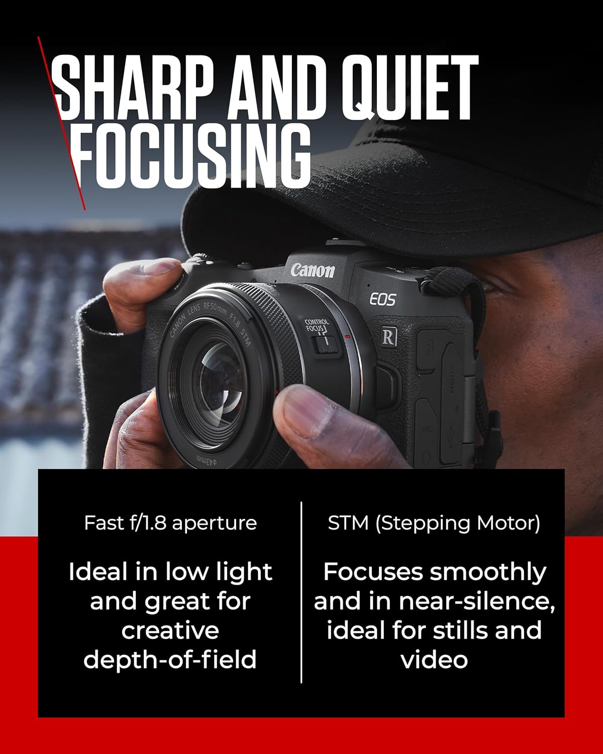 The Canon RF 50mm F1.8 STM lens is a compact, lightweight option for creative photography. With its wide f/1.8 aperture and advanced STM motor, this lens is perfect for portraits and more, delivering sharp images with beautiful background blur. It’s an affordable yet versatile lens for EOS R-Series cameras.