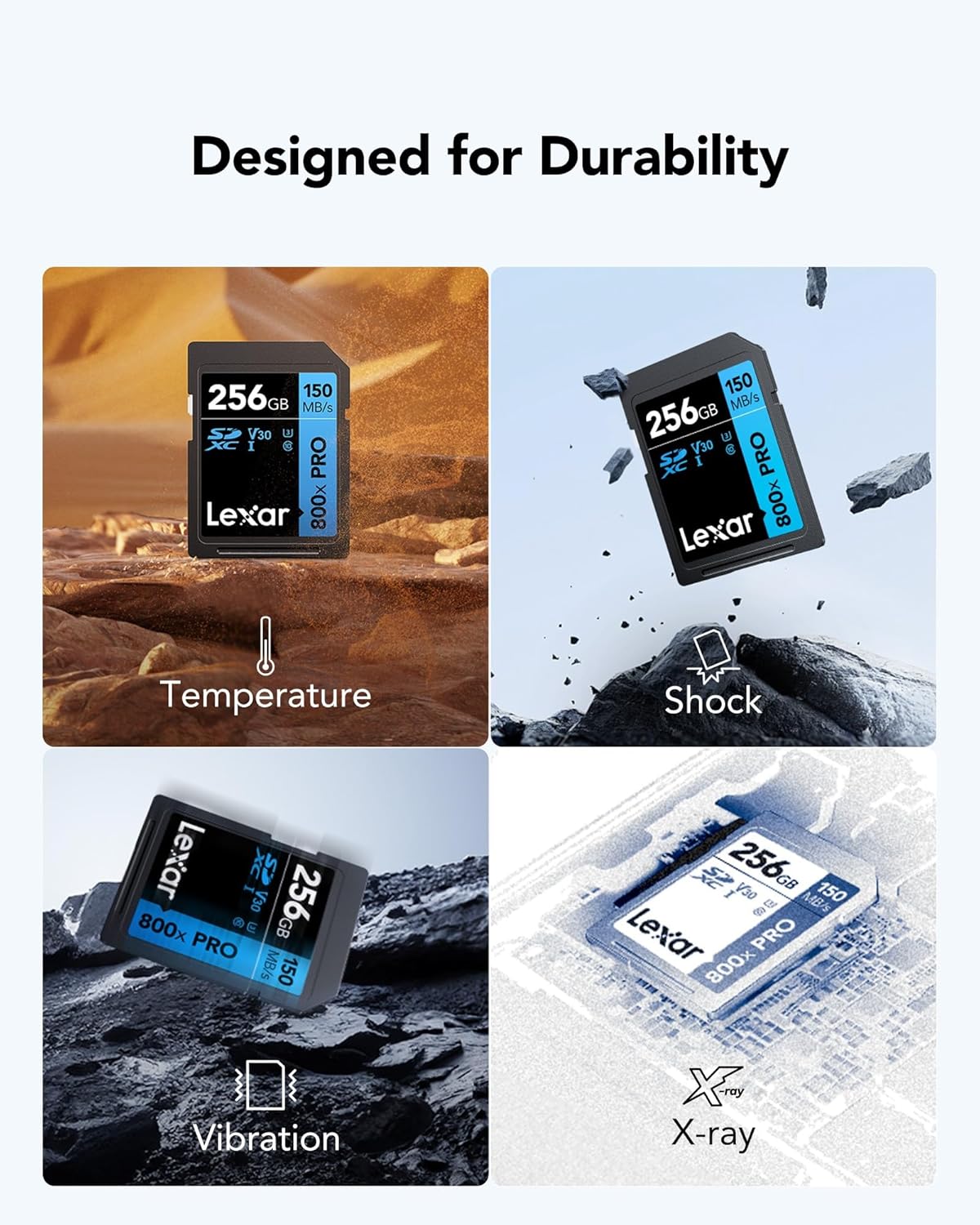 Lexar 800x PRO’s designed for durability-temperature, shock, vibration, and X-ray proof.