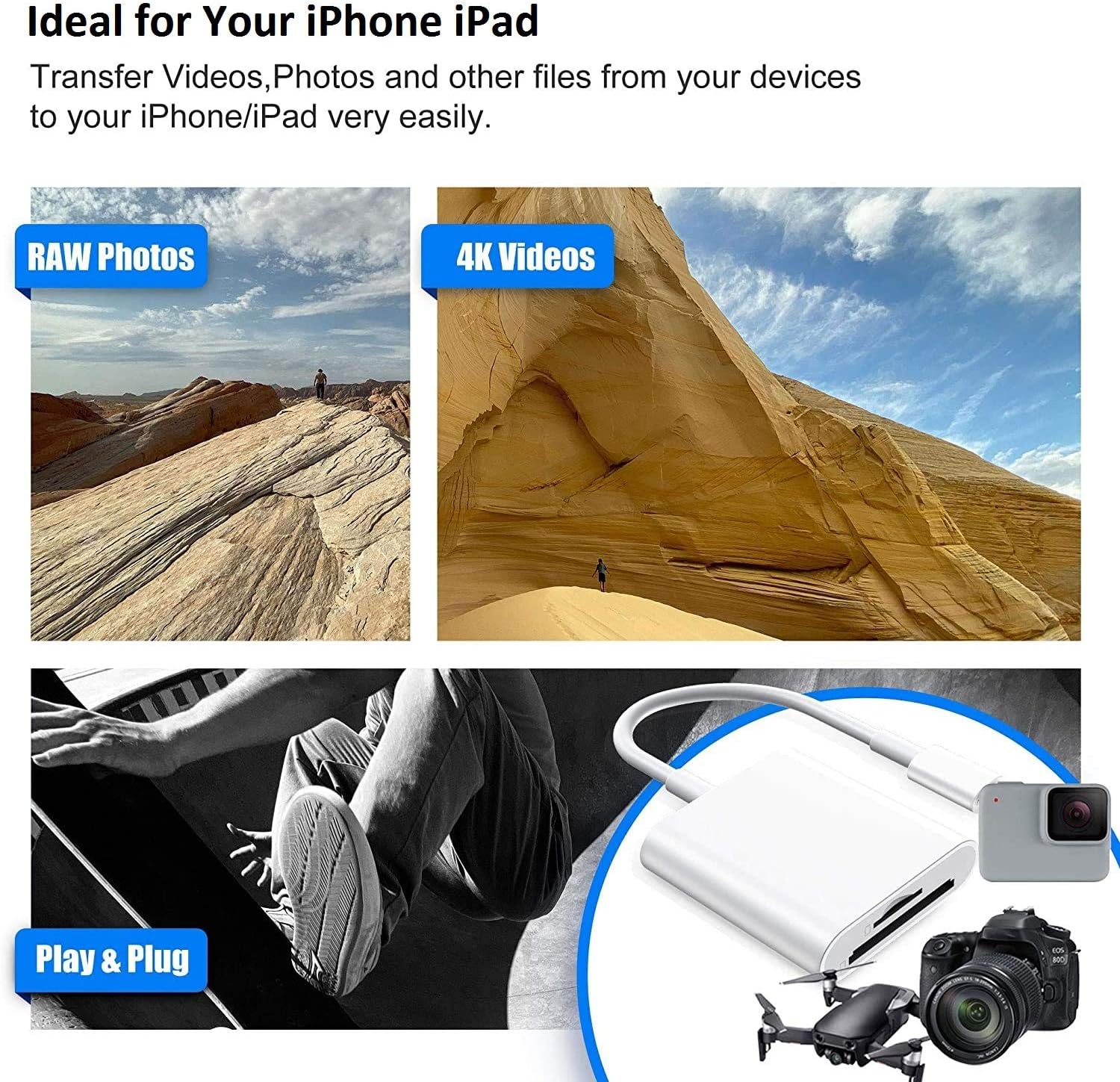 【High Speed Data Transmission】 The transmission speed of this sd card reader for iPhone iPad is up to 30mb/s on iphone and ipad, easily transfer your photos and videos of your camera to your iPhone/iPad in few seconds.