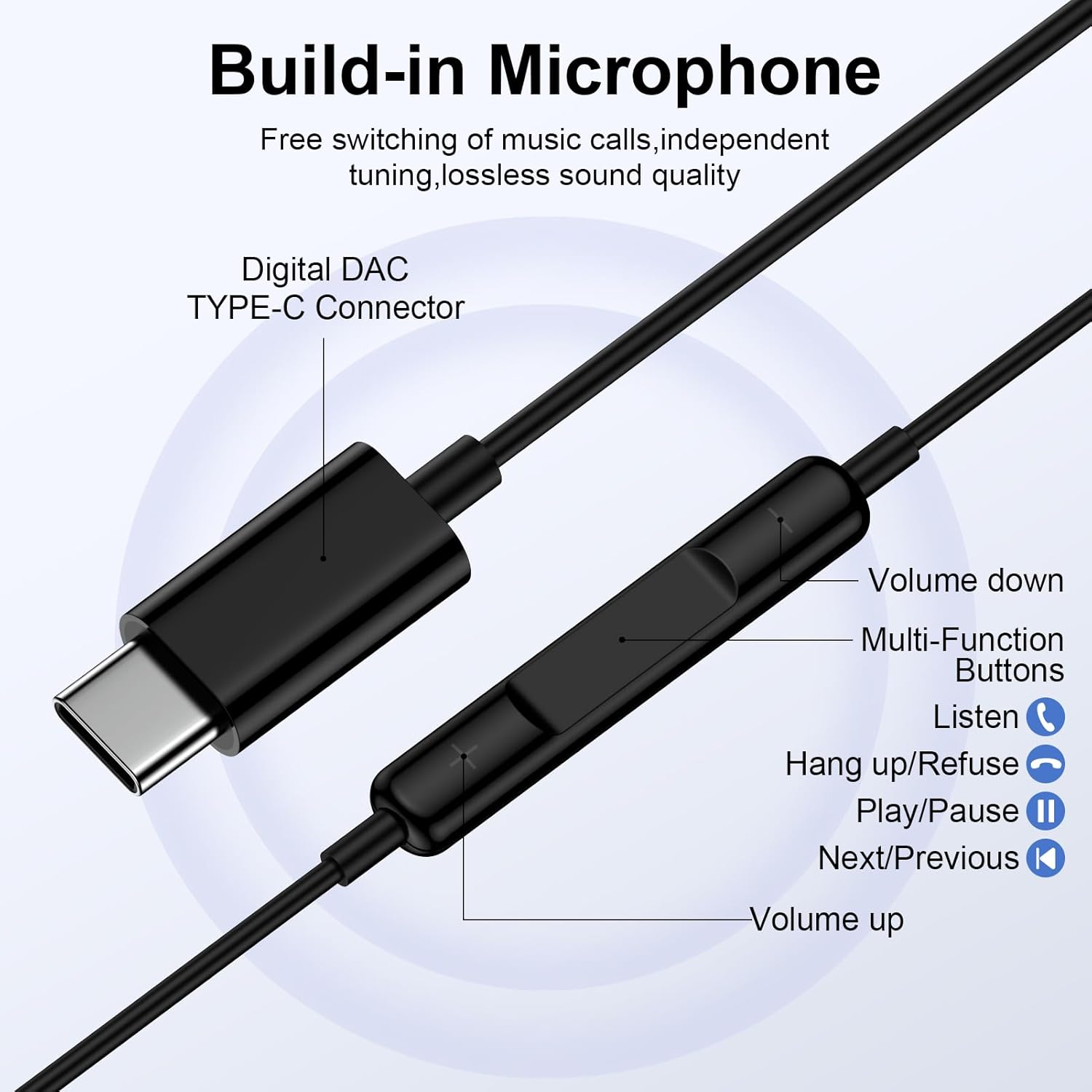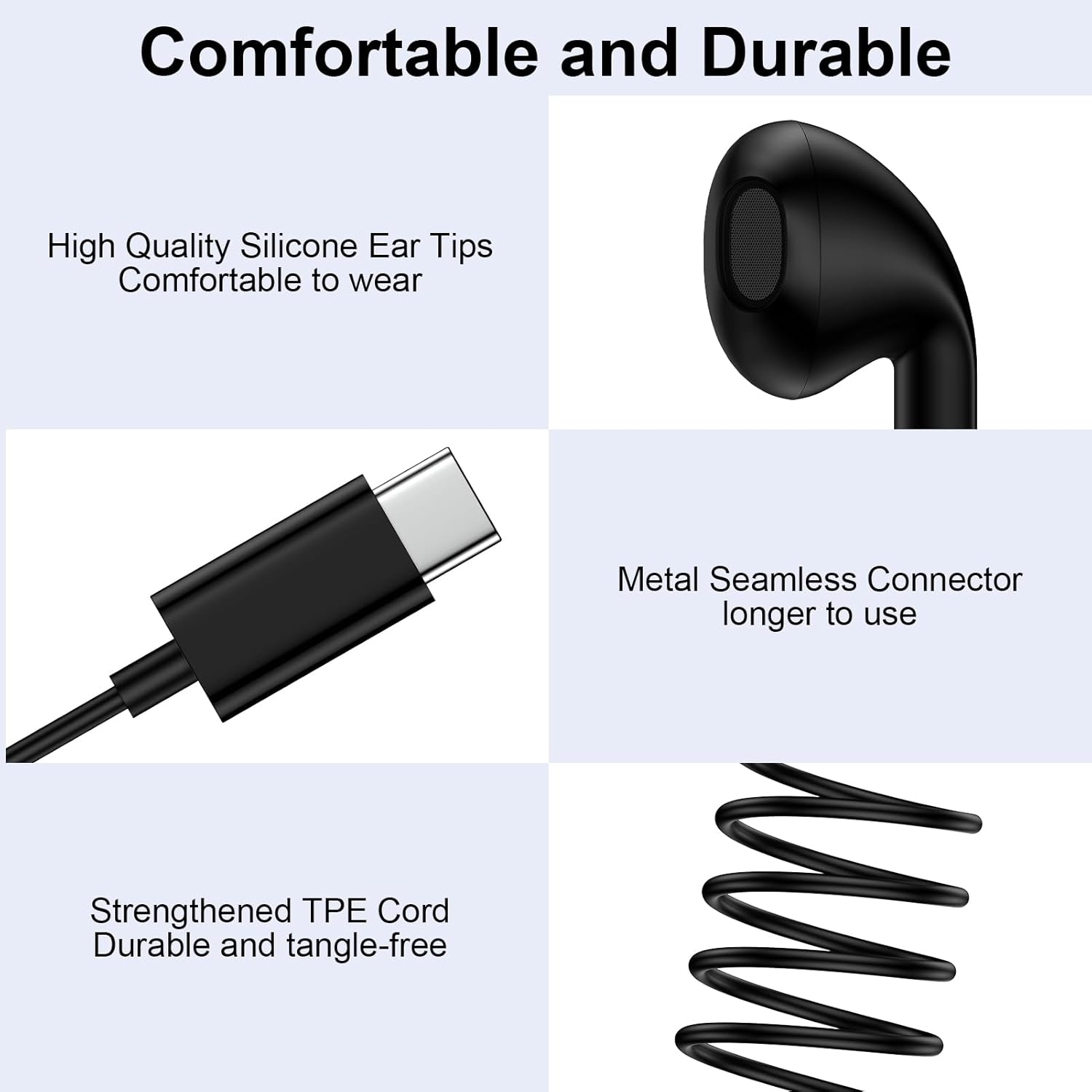 Built-in microphone to make phone calls hands-free when driving,commuting,traveling,running,media entertainment or on the road. USB C Wired Earbuds is snugly fitting for long-term listening.