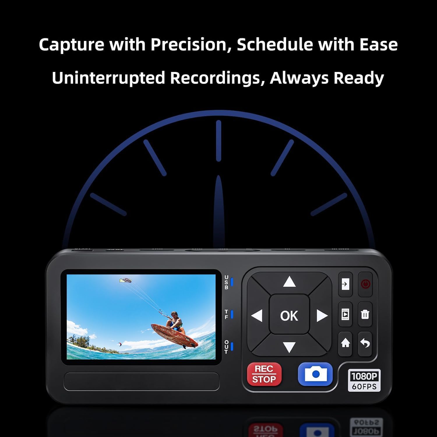 【Innovative Product with External Batteries】- The URayCoder Recorder features an automatic loop recording function, overwriting the oldest clips when the memory is full, ensuring your video capture is always stored. Furthermore, the Recorder’s auto-stop function ensures recording accuracy, allowing you to customize the exact recording duration. Finally, the scheduled recording function allows you to easily schedule specific recording times without missing a recording session. Once these features are configured, you can save your settings and use them later without having to reconfigure them.