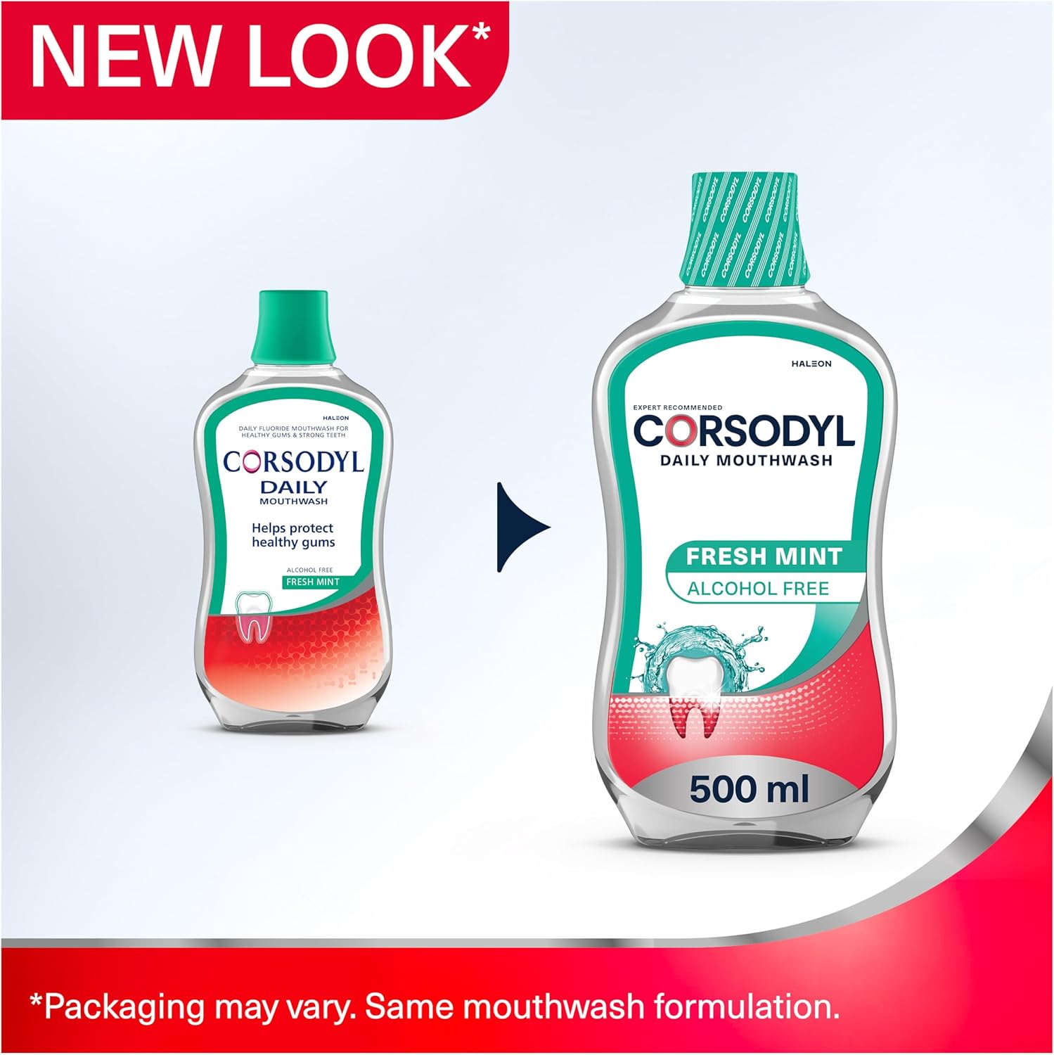Gum problems can be caused by the build-up of plaque bacteria and if left untreated, can affect your oral health. Such bacteria build up on and around your teeth can also lead to bad breath. Corsodyl Fresh Mint Daily Mouthwash contains 0.06 Percent chlorhexidine to help reduce bad breath bacteria.Corsodyl Fresh Mint Daily Mouthwash provides 24-hour gum protection against plaque build-up. It is clinically proven to reduce plaque and also helps to remove more plaque than brushing alone and helps prevent further build up. Used every day it helps protect teeth from plaque that can cause gum disease.Corsodyl Fresh Mint Daily Mouthwash contains 0.06 Percent chlorhexidine which helps to reduce bacteria which causes bad breath. It also contains fluoride to strengthen teeth and help prevent cavities.When used twice daily in combination with tooth brushing. (1)When used twice daily in combination with tooth brushing.