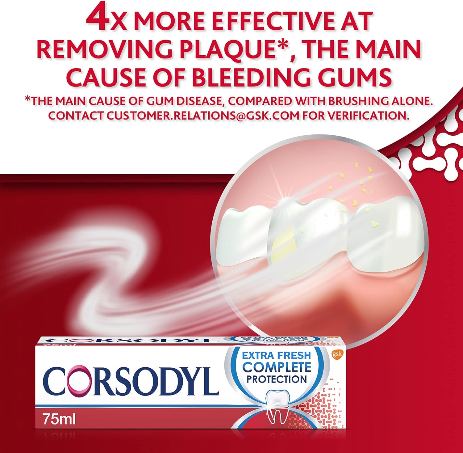 STOP BLEEDING GUMS: Healthy teeth start with healthy gums. Bleeding gums can be caused by the build-up of plaque bacteria along the gum line. Corsodyl Complete Care Toothpaste is 4x more effective at removing plaque than a regular toothpaste.