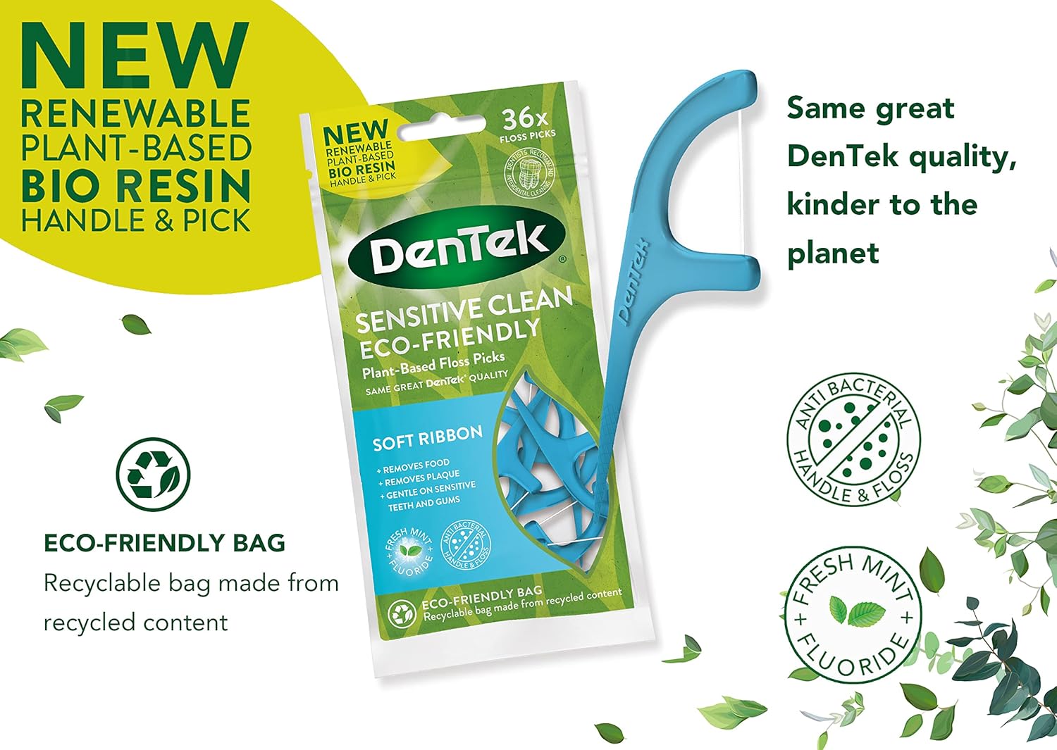 Take your dental hygiene regime to the next level with DenTek Sensitive Eco-Friendly Floss Picks. These Sensitive Dental Floss Picks clean between your teeth and gently massage your gums with a soft, silky ribbon dental floss that is designed to stretch slightly for a softer and comfortable feel. The handles and floss are anti-bacterial and the floss is mint flavoured and fluoride coated for a fresh and clean feeling for your comfort.