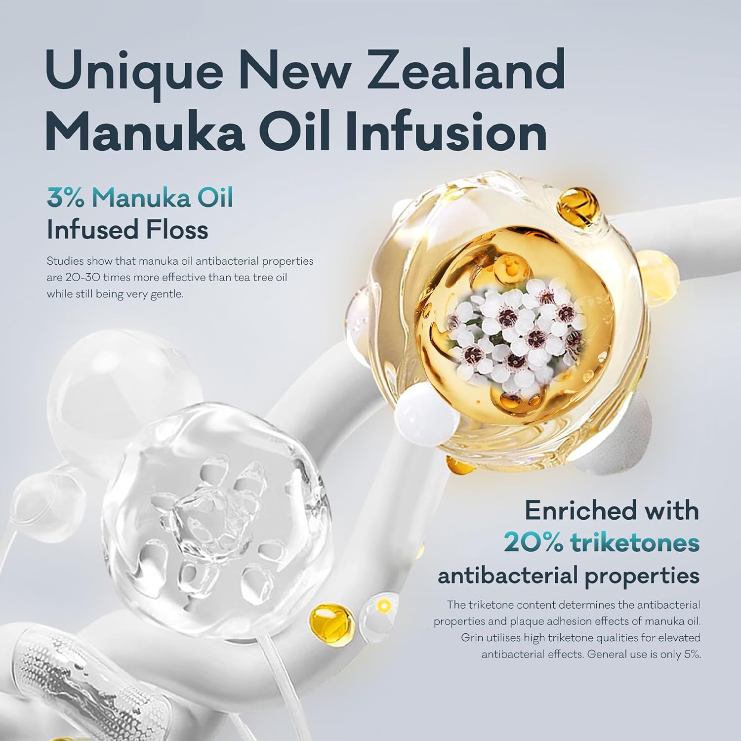 Manuka Oil Infused Floss Tape: The floss is infused with New Zealand Manuka Oil to help control bad breath