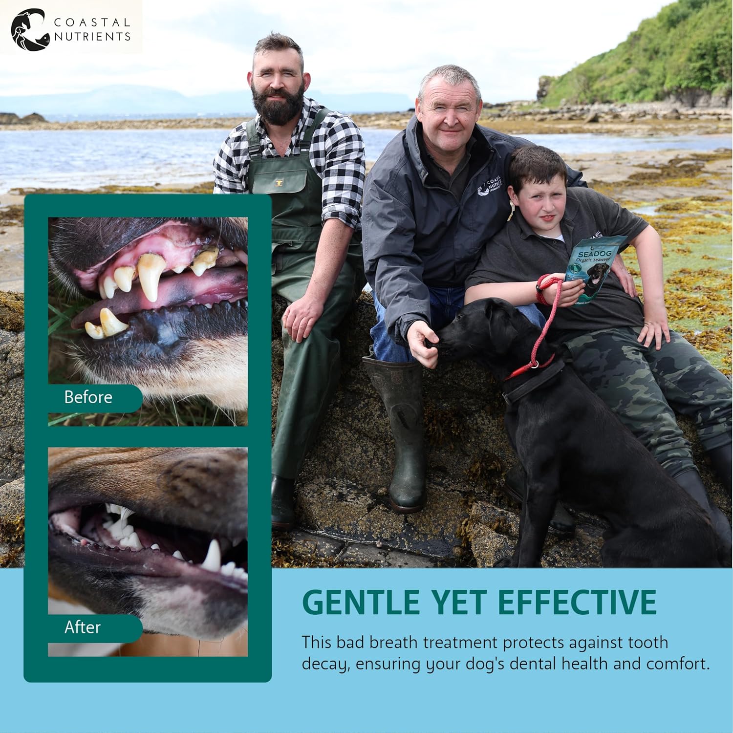But SeaDog isn’t just about gut health – it’s a solution designed to address multiple aspects of your pet’s well-being. Say goodbye to bad doggie breath with SeaDog’s ability to eliminate odours and promote oral hygiene working as a gentle yet effective bad breath treatment for dogs. Protecting against tooth decay, this supplement ensures your dog’s dental health remains pristine, allowing them to enjoy life to the fullest without any discomfort.