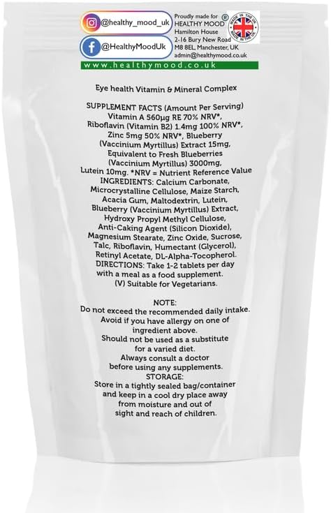Eyehealth Vitamin & Mineral with Blueberry Extract & Lutein Complex 30/60/90/120/180 Veg Tablets Pills Health Food Vision Supplements ? Maintenance of normal vision Vitamin & Mineral food supplement tablets with Blueberry Extract & Lutein. Vitamin A, Vitamin B2 & Zinc contribute to the maintenance of normal vision. Contains Lutein. One tablet typically provides: Vitamin A 560µg RE 70% NRV* Riboflavin (Vitamin B2) 1.4mg 100% NRV* Zinc 5mg 50% NRV* Blueberry (Vaccinium Myrtillus) Extract 15mg Equivalent to Fresh Blueberries (Vaccinium Myrtillus) 3000mg Lutein 10mg Ingredients:Calcium Carbonate, Microcrystalline Cellulose, Maize Starch, Acacia Gum, Maltodextrin, Lutein, Blueberry (Vaccinium Myrtillus) Extract, Hydroxy Propyl Methyl Cellulose, Anti-Caking Agent (Silicon Dioxide), Magnesium Stearate, Zinc Oxide, Sucrose, Talc, Riboflavin, Humectant (Glycerol), Retinyl Acetate, DL-Alpha-Tocopherol No artificial colour, flavour or preservatives Directions for use: Adults and children over 12 years: Swallow one tablet daily, with food. Do not exceed the stated daily intake.